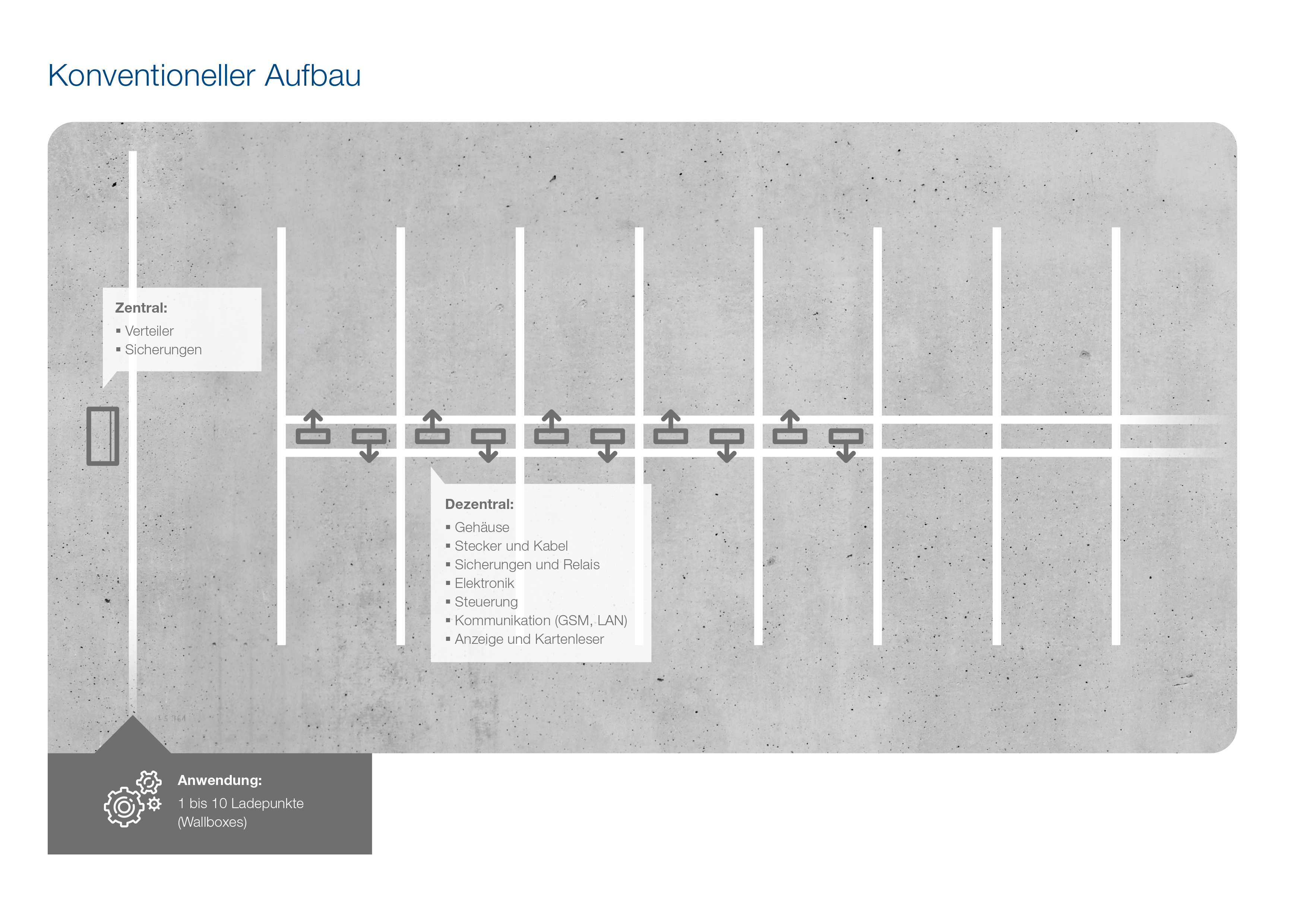 Anders als bei bisherigen Lösungen verfügt jeder Parkplatz praktischerweise über ein fest angeschlagenes Kabel. Das Hantieren mit dem eigenen Ladekabel kann somit entfallen. Die Steuerung der Ladepunkte erfolgt in zentralen Schaltschränken, in denen auch das Lastmanagement untergebracht ist. An eine dieser Steuereinheiten können dabei bis zu 36 Ladepunkte angeschlossen werden. Falls erforderlich wird bedarfsgerecht die Leistung der einzelnen einphasigen Ladepunkte reduziert. Ein weiterer, nicht zu unterschätzender Kostenvorteil der zentralen Steuereinheiten ist die bessere Wartbarkeit. Anstatt die Elektrik jeder einzelnen Wallbox oder Ladesäule einzeln zu prüfen, reicht bei chargeBIG eine Sichtprüfung der Ladekabel an den Ladepunkten. Die restlichen elektrischen Wartungsarbeiten können zentral an den Steuereinheiten erfolgen.